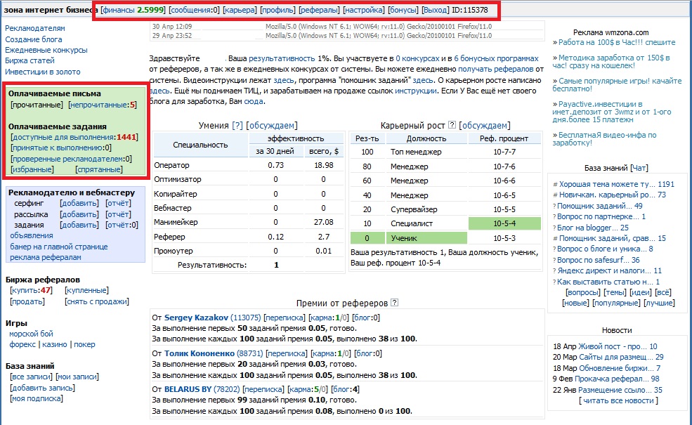"сообщения" - содержат все сообщения, которые прислали Вам пользователи системы (Реферер, это человек пригласивший Вас в проект, от него вы получаете бонусы, а также консультации по работе на сайте, к нему можно обращаться по любым вопросам, касающимся проекта)